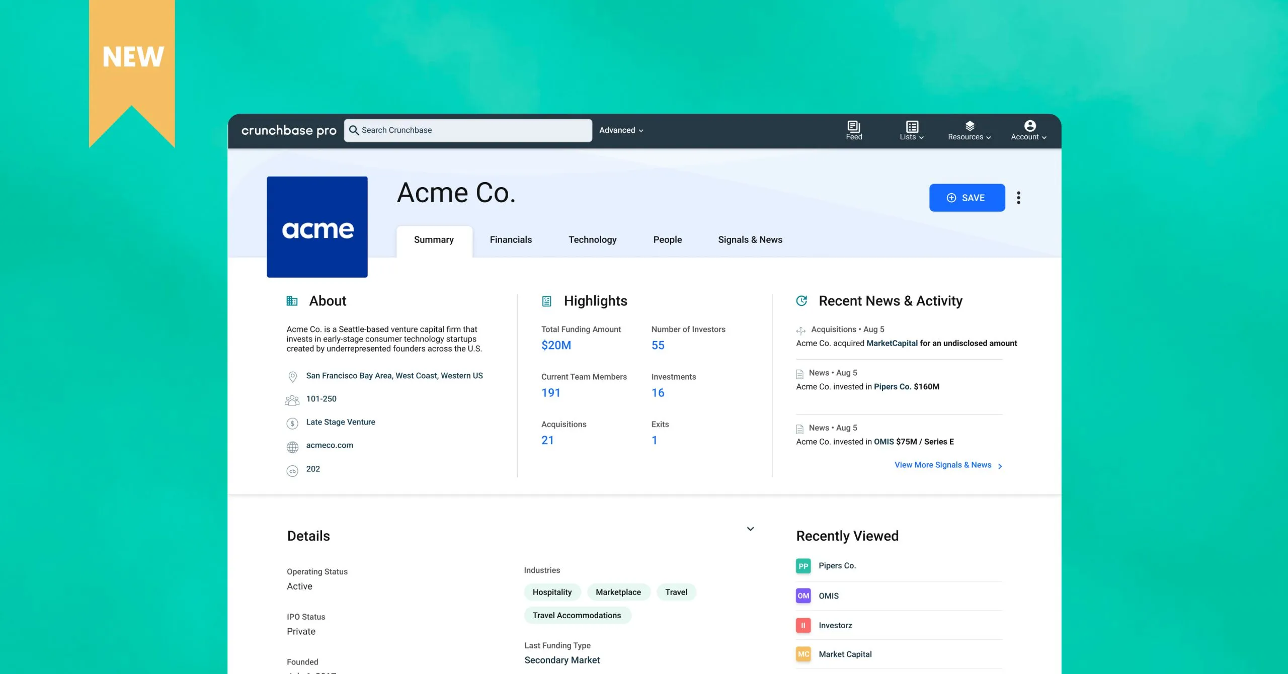 Crunchbase’s redesigned company profile pages allow you to quickly understand what a company does and analyze financial performance and important growth signals, allowing you to identify better opportunities in less time.