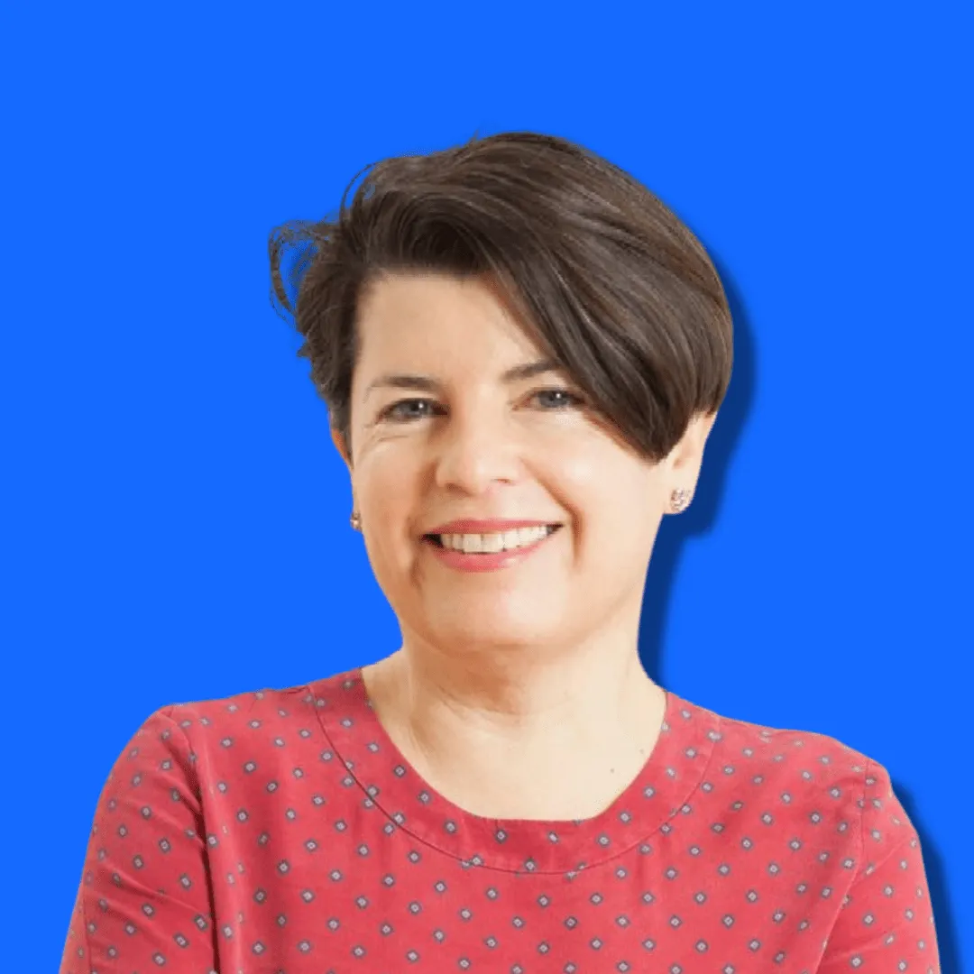 Smiling woman with long, curly brown hair and light eyes wearing a dark brown top against a plain light background.