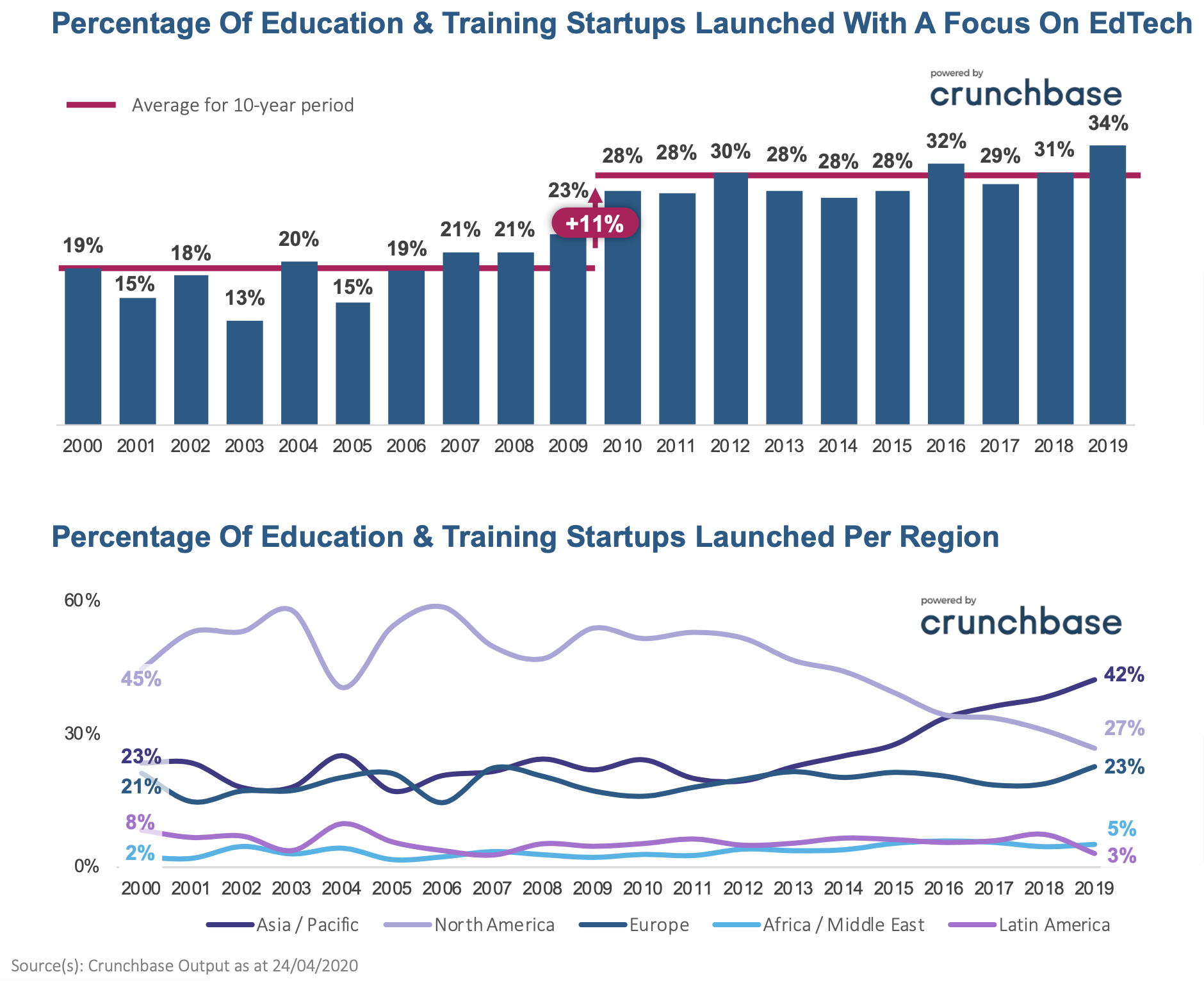 While EdTech has historically only accounted for 3% of total Education & Training spend, the fast-growing and innovative nature of the sector is encouraging the launch of growing numbers of EdTech startups. According to Crunchbase, almost 2,000 new EdTech companies were founded globally since 2010. This equates to an increase in EdTech-focused startups of 11% in the last decade. North America was home to the most startups historically, but the Asia / Pacific region has recently overtaken and contributed over 42% of the new startups in 2019.
