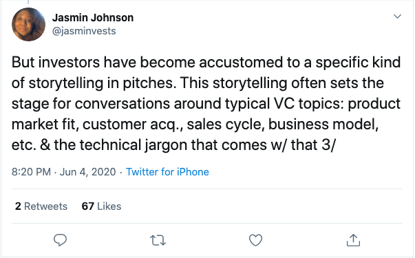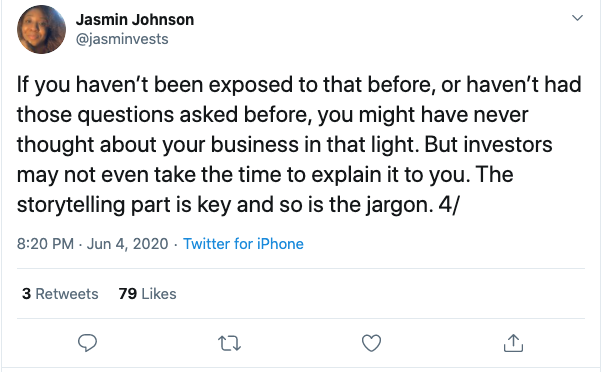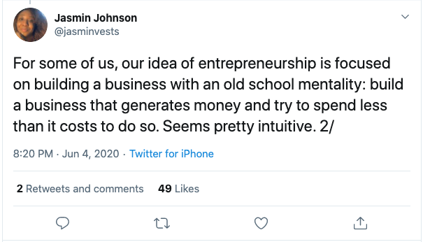 A few weeks ago Jasmin Johnson, one of only a few Black female investors, tweeted: