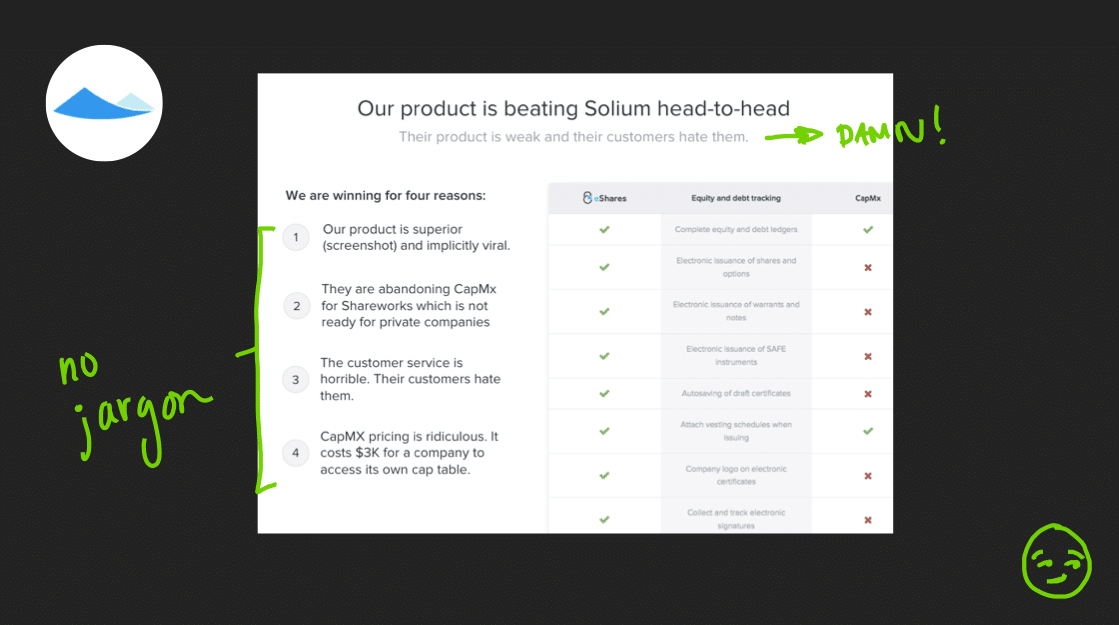 We love this crisp title and description. The bullet points are entirely straightforward and have no jargon. They tear apart their competitor swiftly and succinctly to make you ask yourself “Why would I ever choose Solium?” That’s exactly what you want as a presenter.