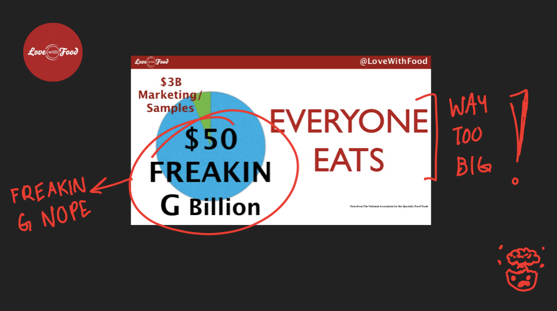 How Love With Food concluded that their TAM (total addressable market) is $50 billion is completely unknown. At this point, an investor would have completely discounted their entire slide as useless and not valuable.
