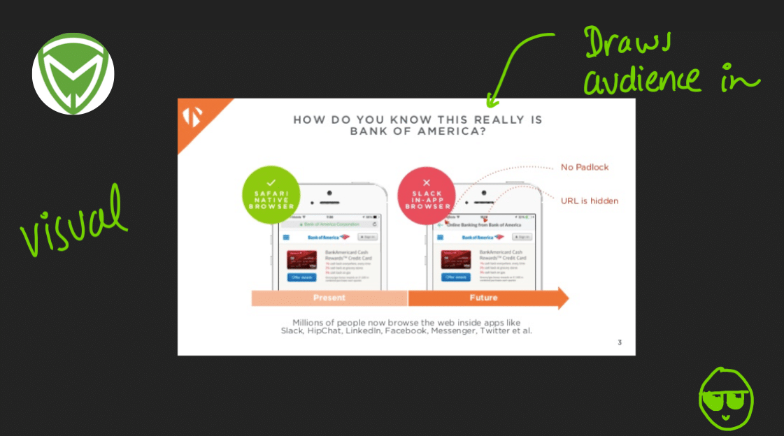 Here is a great example of less is more. Your words matter, but you don’t need a lot of them. This compelling 5-second investor pitch makes me want to read the whole deck and is part of the super exciting power that fewer words provide.