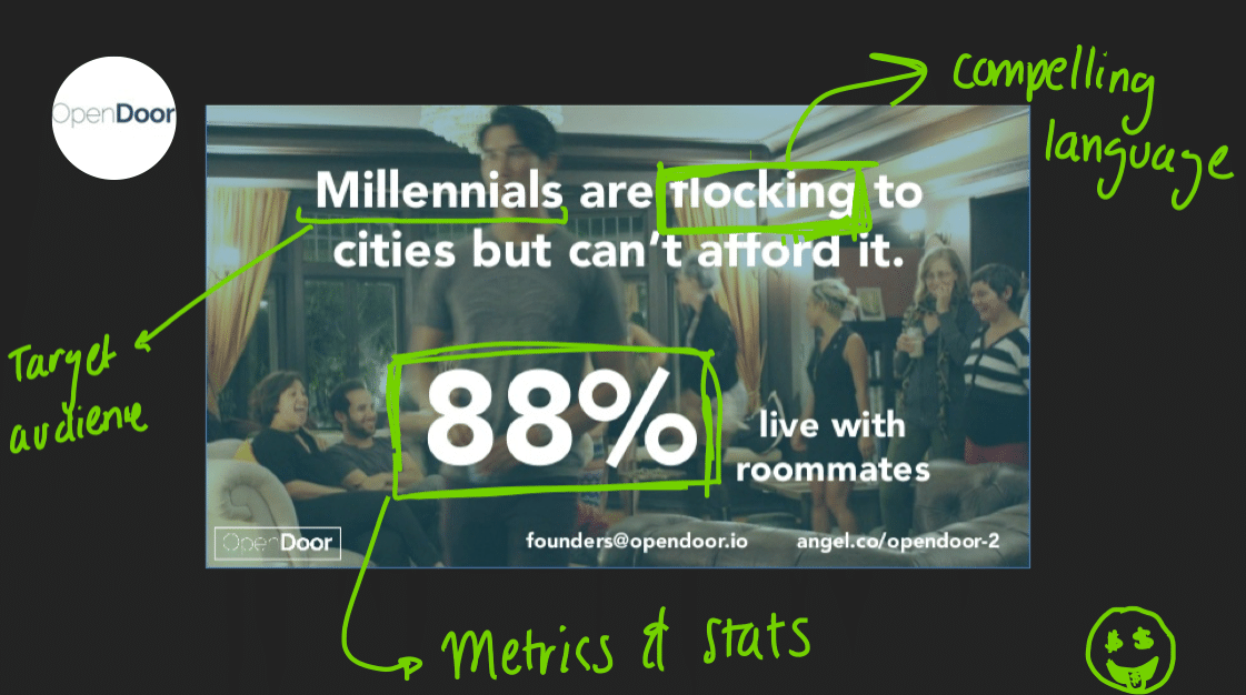 So this is a great slide and example pitch deck design. We are immediately drawn because of the compelling problem and the tangible metric. Additionally, investors can quickly see a pain point and a big opportunity. Opendoor also did a great job of picking a cool font and cool background that wasn’t too busy and still engaging. This slide gets investors excited, and therefore would ultimately get the pitcher fired up to tell the story and explain the pain points repeatedly.