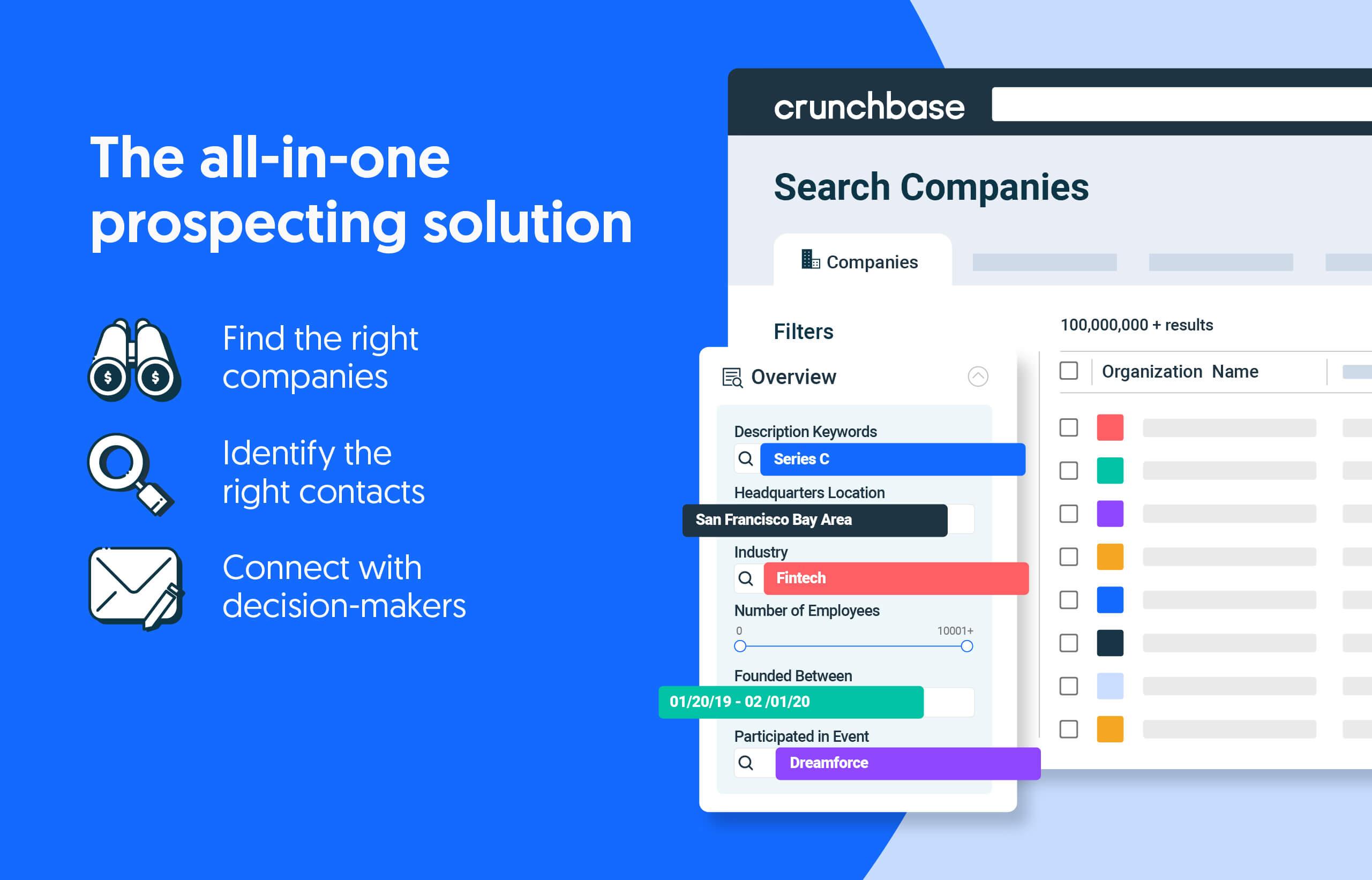 Crunchbase is an all-in-one sales prospecting tool that can help your SaaS sales team discover new accounts and connect with decision-makers.