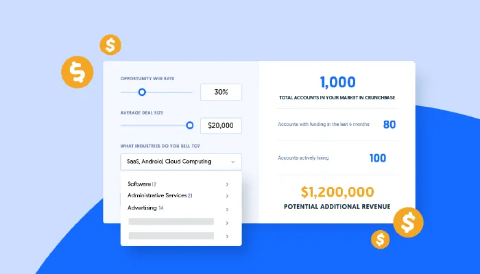 Introducing Crunchbase’s sales ROI calculator, an interactive tool that shows you the number of accounts in your territories that have buying power right now and the potential additional revenue you can generate with Crunchbase.