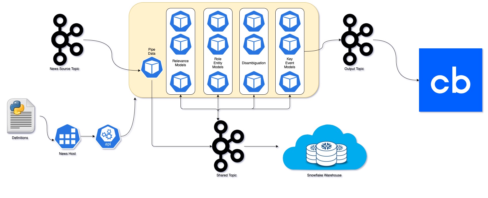 Perhaps unsurprisingly, detecting these events automatically at scale requires machine learning models and services. Due to rapidly changing techniques, technologies and data, it is widely accepted that deploying machine learning models into production is a challenging industry task. One of the most important aspects of our architecture therefore is that it allows machine learning services to be developed independently, while keeping them integrated in a system that deploys many models both in the same and in separate micro-services.