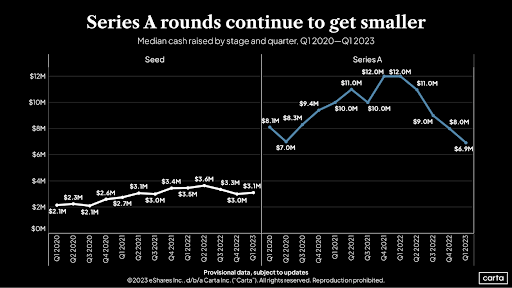 Median Cash Raised by Stage and Quarter, Carta State of Private Markets: Q1 2023