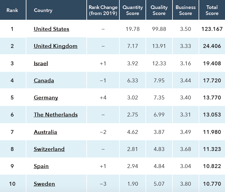 When compared with 2019, this year has seen no new countries enter the top ten, and yet, Germany has made a significant jump of 4 places to 5th, while Spain has moved 1 spot to 9th. The Big 4 club of countries (US, UK, Israel, and Canada) has held its ground since 2017, showing that there is a real gap between these 4 countries and those below that will be hard to narrow.
