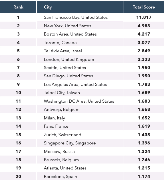 As for the cities, San Francisco (1st) is followed by two other US cities on the podium: New York and Boston. The response and adaptation of New York to the effects of the Coronavirus crisis have been outstanding considering that it has been one of the worst-hit areas in the world. Boston, on the other hand, is historically known for having great health-related startups. This tendency shows, as it closely follows New York to take third in the rankings.