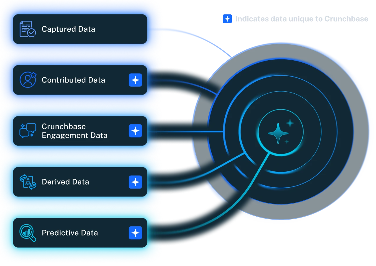 Crunchbase has the only combination of data that can predict trends and major milestones across millions of private companies. We integrate vast amounts of data from the internet, government filings, direct input from knowledgeable investors and employees, thousands of data partners, an internal team of hundreds of experts, and aggregated usage data from Crunchbase’s 80 million active users.