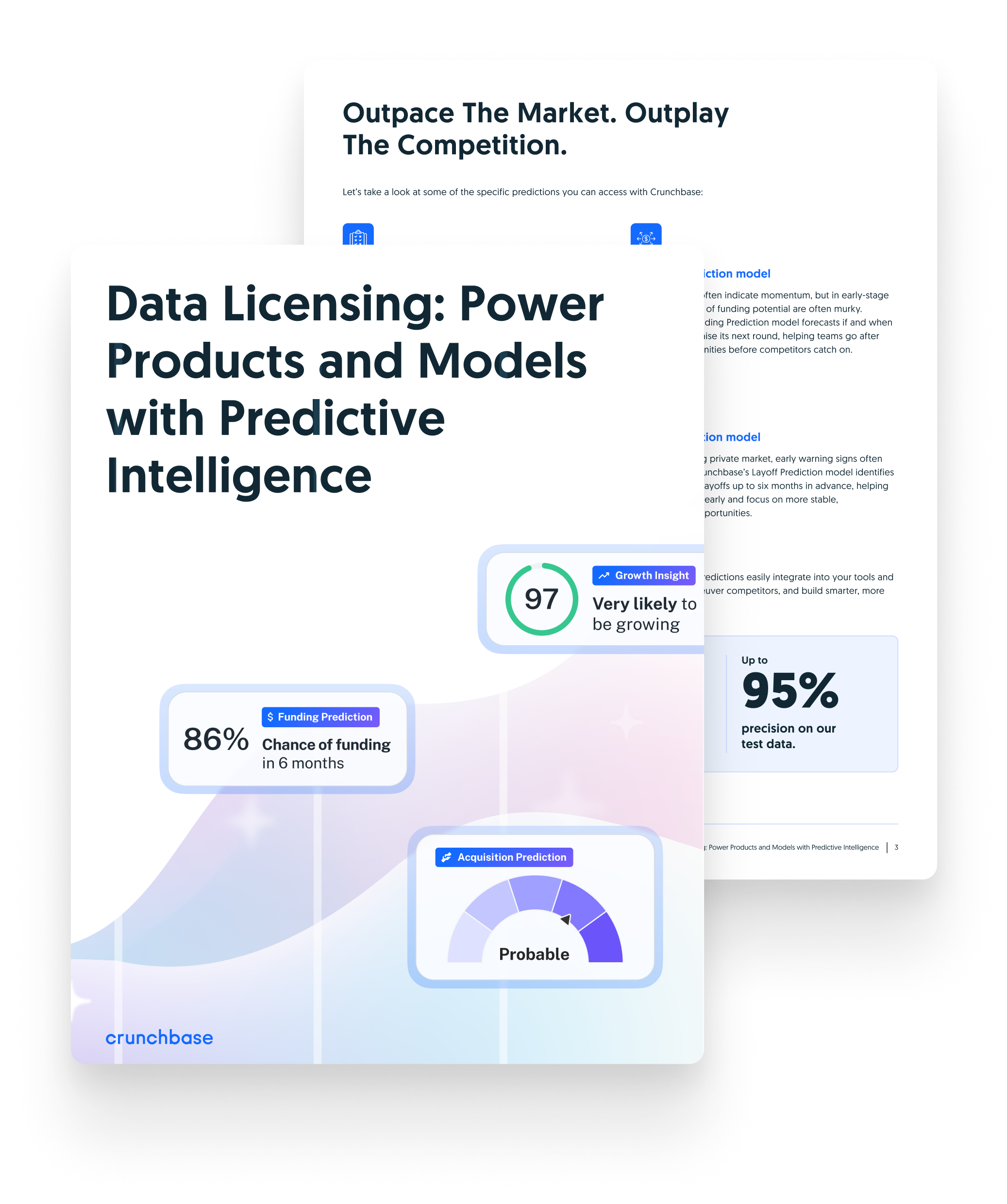 We created this guide to show you how to power your products and models with the same trusted predictive intelligence that fuels Crunchbase — helping you strengthen your product’s value and stand out in a competitive market.