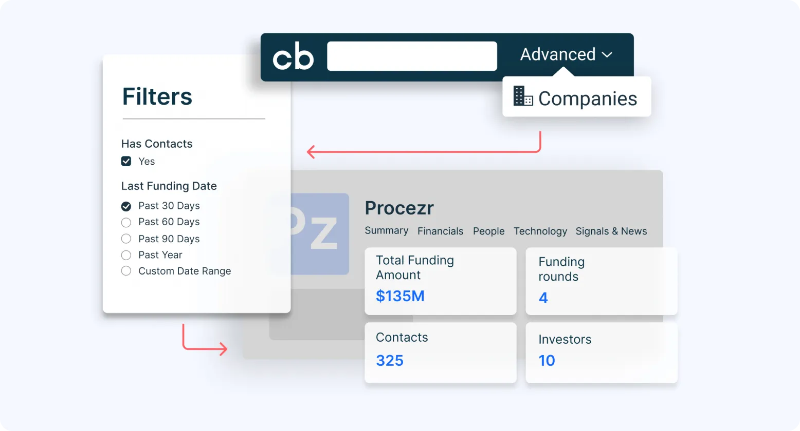 Use Crunchbase to uncover insights about your prospects’ funding, leadership hires and tech stacks, and set up automatic notifications for company buy signals. Paying attention to buy signals will ensure you act on the most relevant prospects right away. Here’s a list of companies funded within the past 90 days that you can use as a starting point for finding the companies you care about.