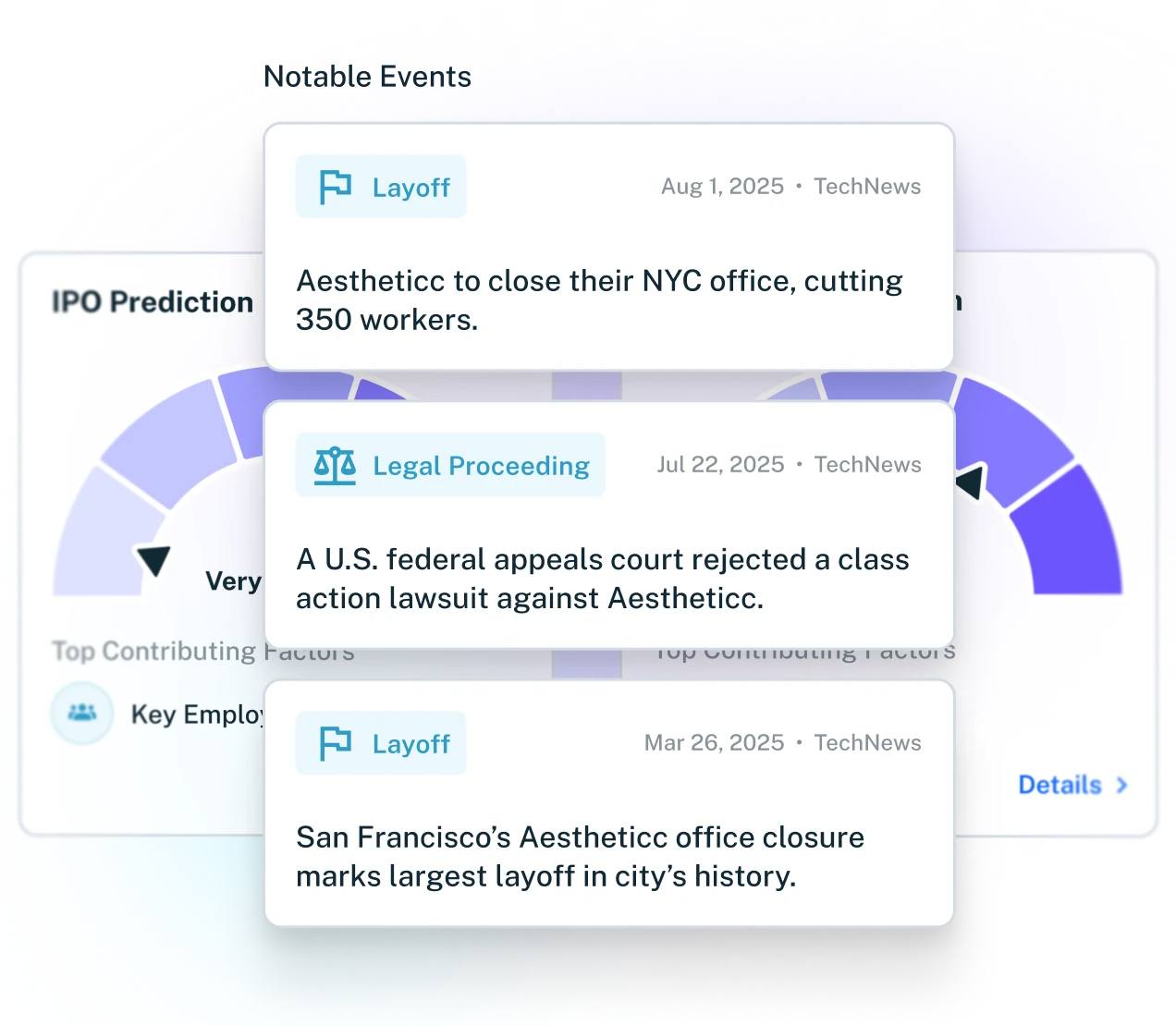 Speed up evaluation with predictions that surface thesis-aligned opportunities and reveal exit potential, market fit, and leadership shifts.